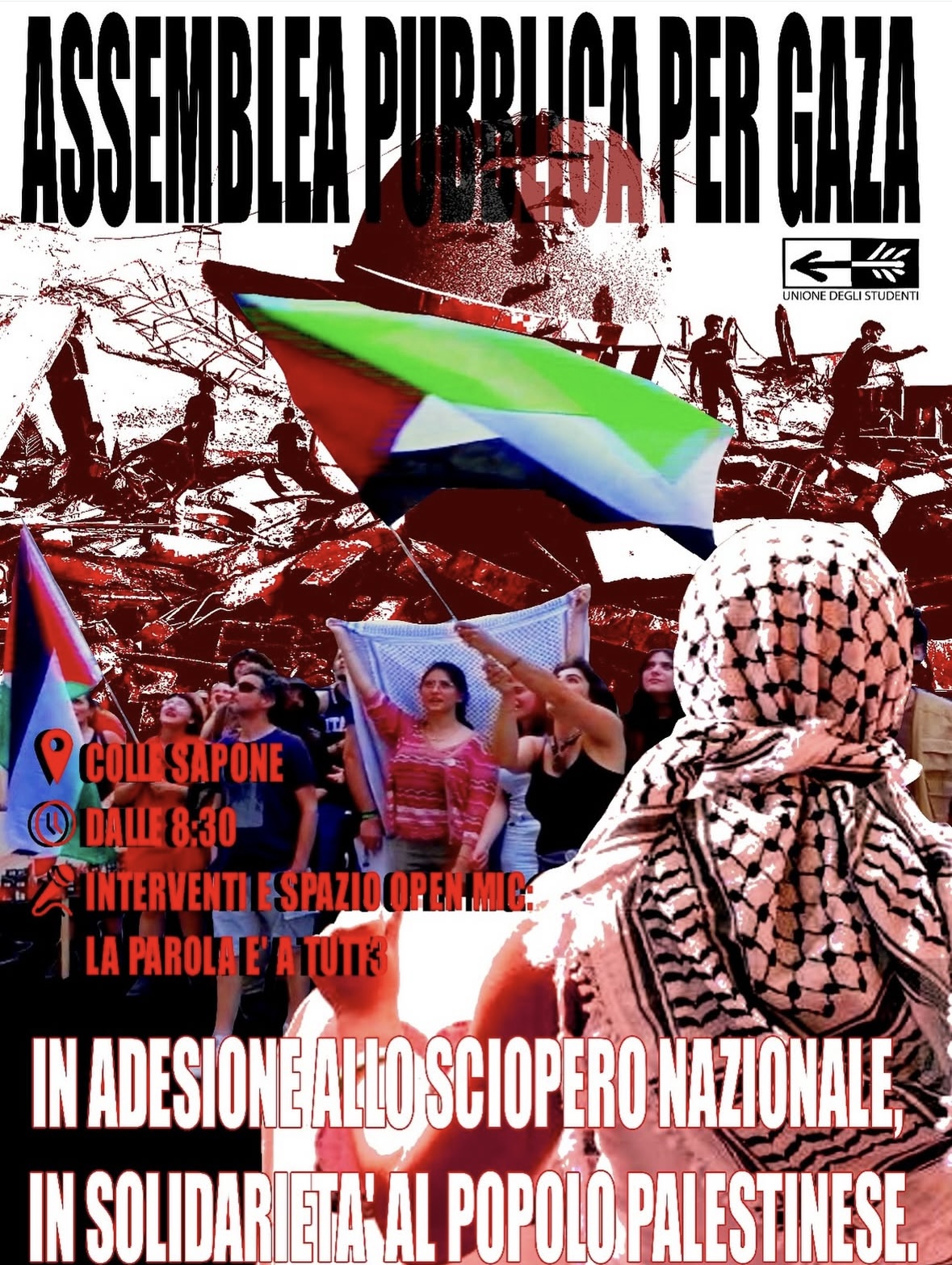 Assemblea pubblica, questa mattina nel polo scolastico di Collesapone, dell’Unione degli studenti che ha aderito allo sciopero generale nazionale indetto dai sindacati in solidarietà al popolo palestinese.