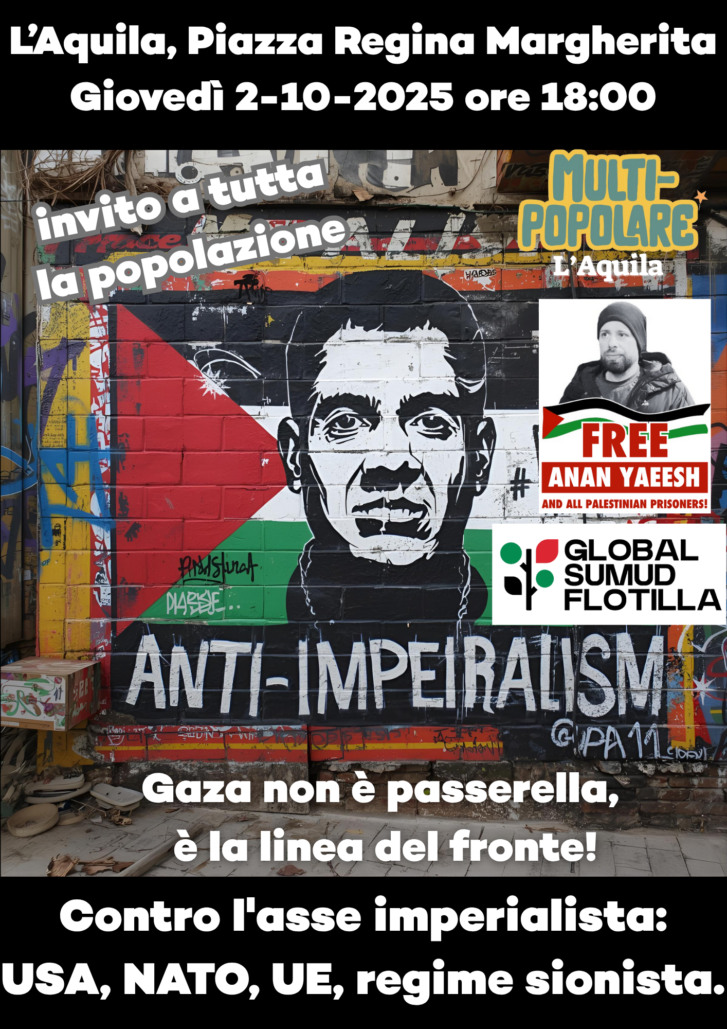 Proprio nella giornata in cui la Global Sumud Flotilla dovrebbe raggiungere le acque che costeggiano la Striscia di Gaza è stato, infatti, annunciato un nuovo presidio promosso dall’associazione Multipopolare L’Aquila.