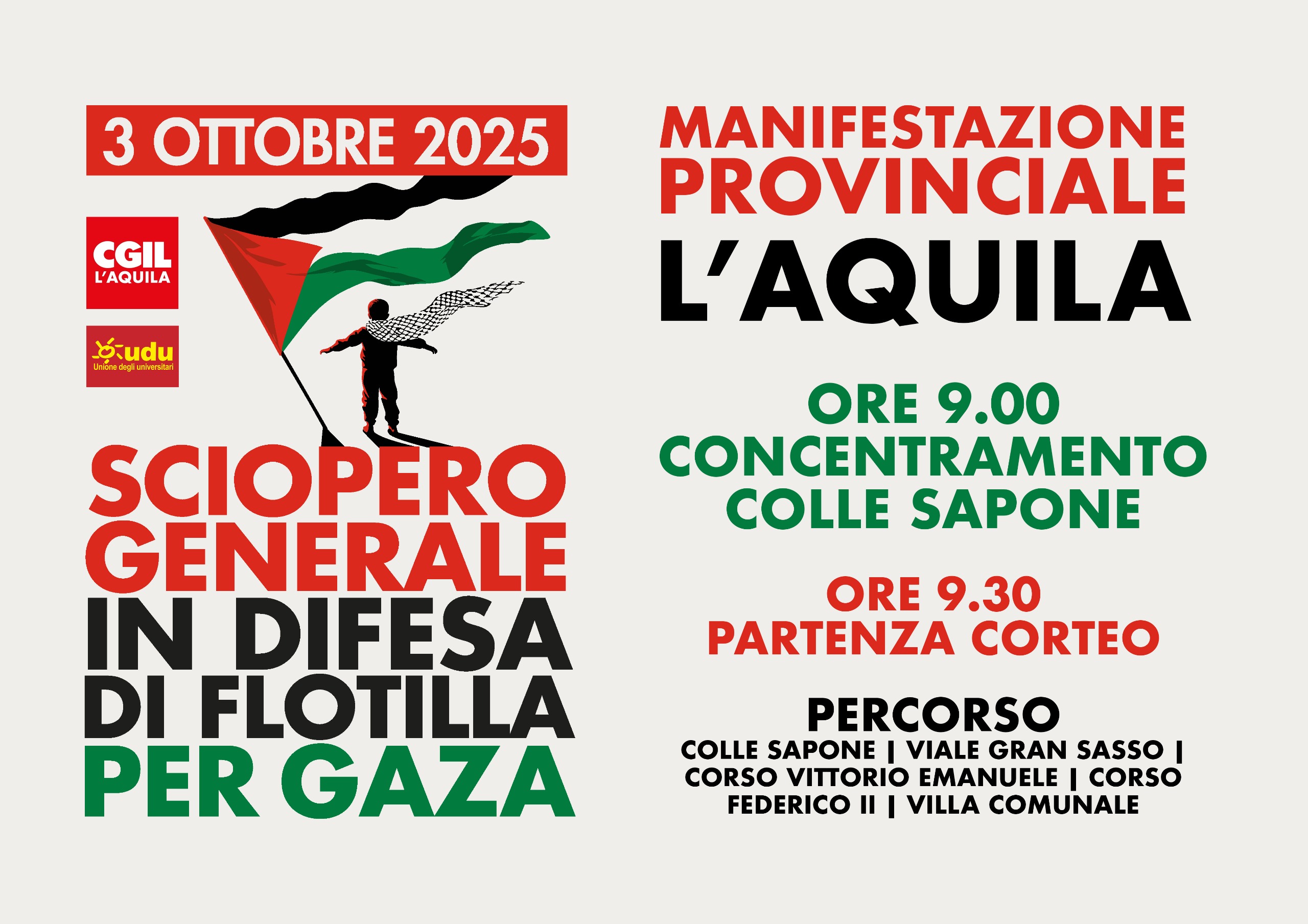 Lo scrive in una nota il segretario generale CGIL L’Aquila Francesco Marrelli che afferma: «Scendiamo in piazza a difesa del popolo palestinese, della missione Global Sumud Flotilla, della pace, della giustizia, del diritto internazionale. Stop al genocidio! Palestina libera! Perciò, scioperiamo, in tutti i settori, pubblici e privati, per l’intera giornata di venerdì 03 ottobre, e invitiamo tutti e tutte, cittadini e cittadine, lavoratori e lavoratrici, pensionati e pensionate, studenti e studentesse, le associazioni, i movimenti, le istituzioni e i partiti a partecipare alla manifestazione».