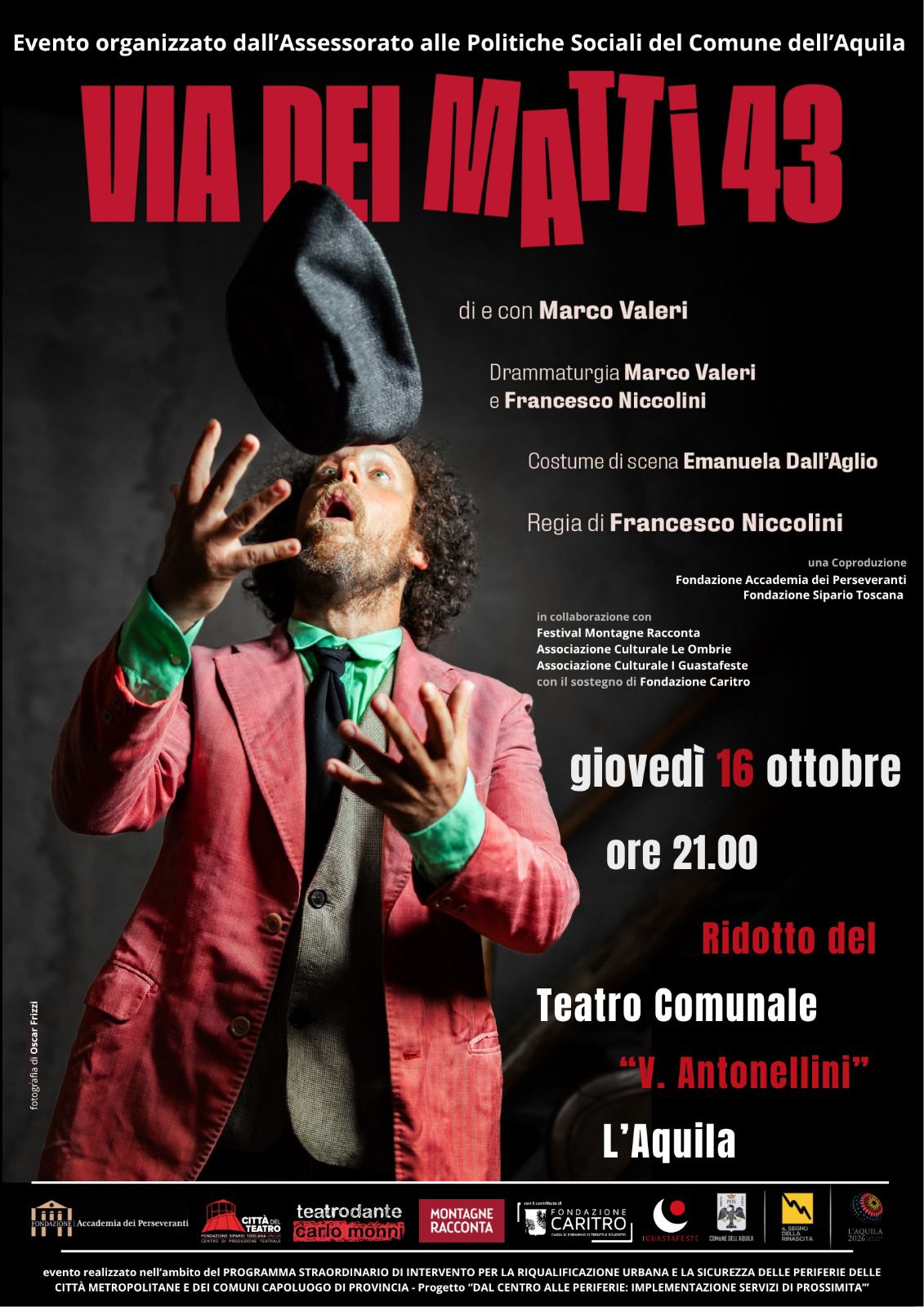 L’opera, scritta e interpretata da Marco Valeri con la regia di Francesco Niccolini, è stata selezionata dall‘Assessorato alle Politiche sociali del Comune dell’Aquila e inserita all’interno del progetto “Dal Centro alle Periferie” e verrà proposta come un’occasione per abbattere barriere sociali che nonostante le nuove prospettive troppo spesso restano saldamente radicate.