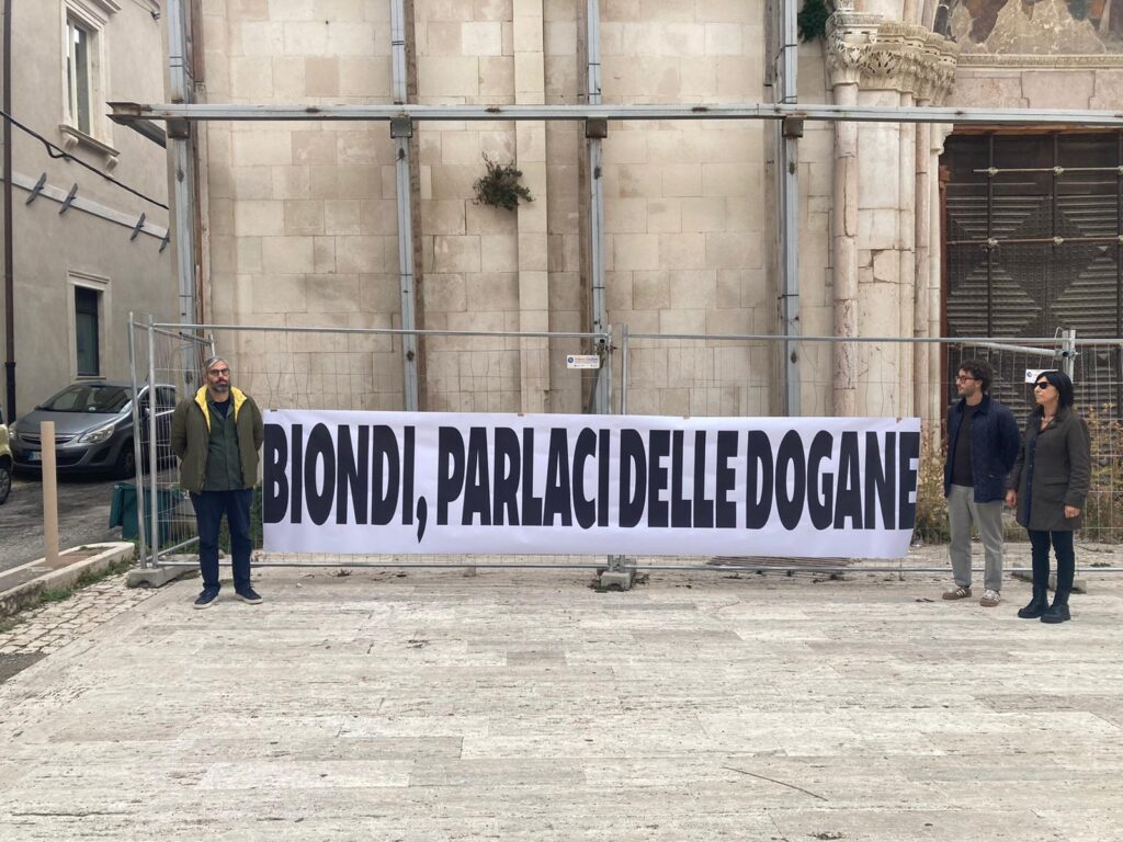 Ad intervenire sul tema sono stati in particolare i consiglieri Paolo Romano, Simona Giannangeli e Lorenzo Rotellini che, in segno di protesta, si sono presentati dinanzi alla sede aquilana dell’Agenzia delle dogane, nel prestigioso palazzo Alfieri-De Torres-Dragonetti, con uno striscione che riportava la scritta a caratteri cubitali «Biondi parlaci delle dogane».