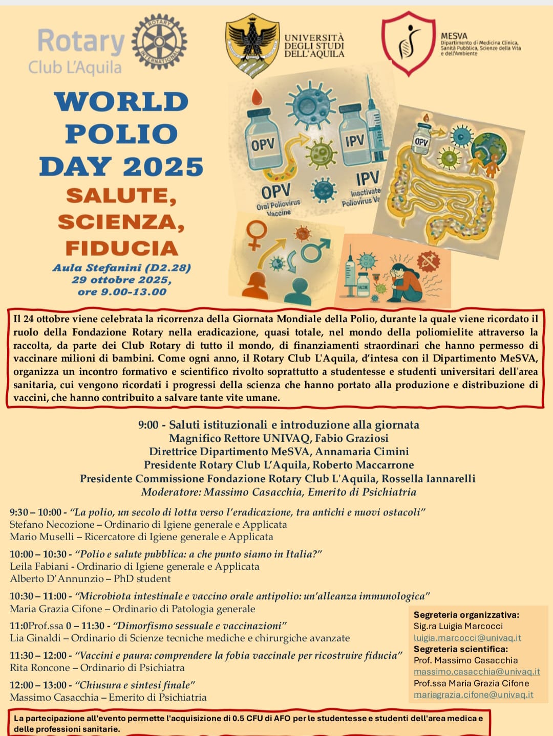 A L’Aquila l’appuntamento è fissato per il 29 di ottobre, giorno in cui il Rotary Club L’Aquila, d’intesa con il Dipartimento MeSVA dell’Ateneo aquilano, ha organizzato un incontro formativo e scientifico rivolto soprattutto a studentesse e studenti universitari dell’area sanitaria che avrà luogo , a partire dalle 9:00 del mattino, all’interno dell’Aula Stefanini della facoltà di Medicina. Per gli studenti la partecipazione all’evento consentirà l’acquisizione di 0.5 CFU di AFO.