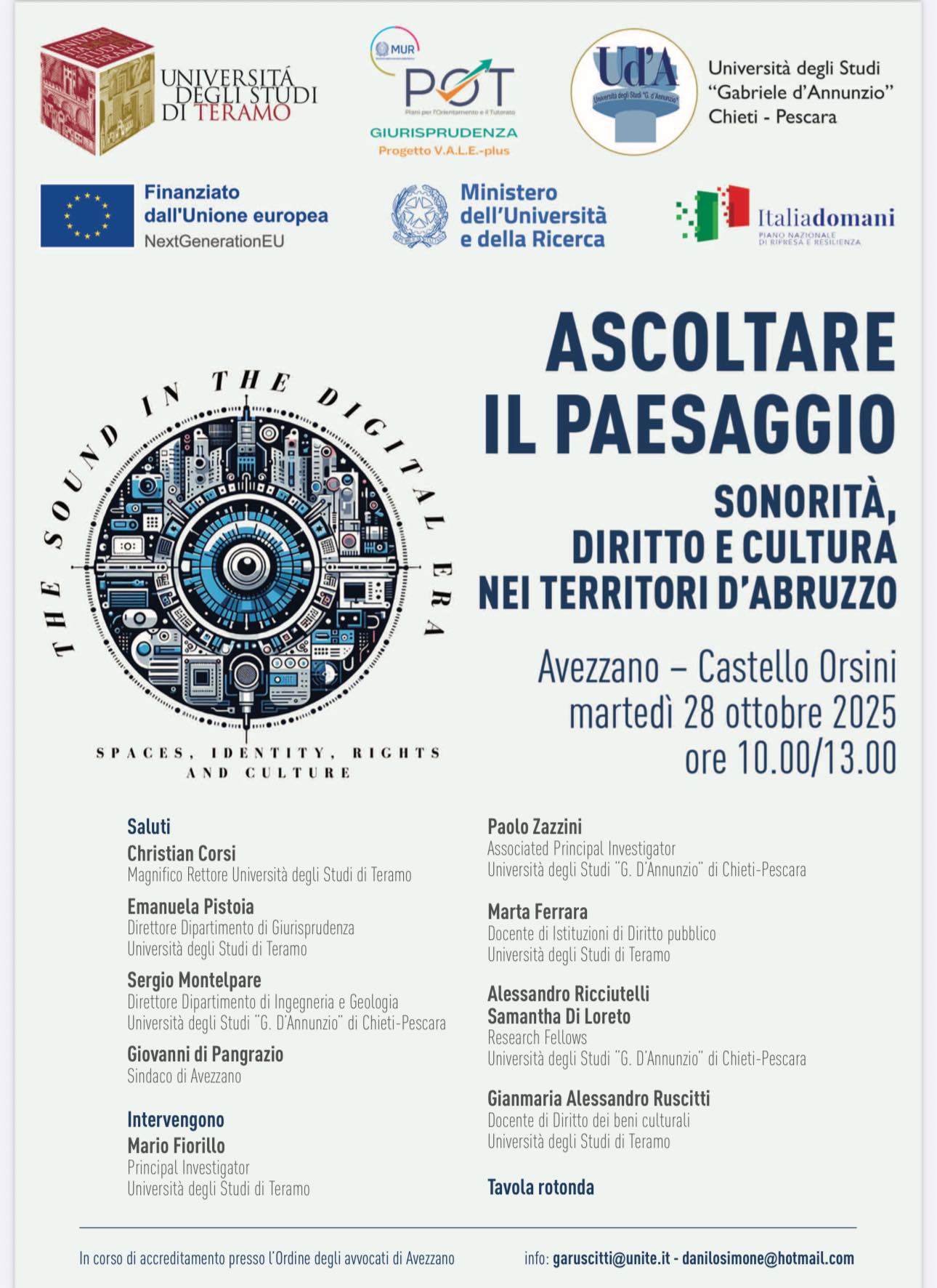 Su questi temi si concentrerà il convegno “Ascoltare il Paesaggio: Sonorità Diritto e Cultura nei Territori d’Abruzzo”, che si terrà il 28 ottobre 2025, alle ore 10, all’interno del Castello Orsini di Avezzano, che vede l’organizzazione e il patrocinio di Università degli Studi di Teramo, Pot – Piano Orientamento per il Turismo del Nur, Giurisprudenza – Progetto Vale Plus, Università degli Studi “G. D’Annunzio” Chieti-Pescara, Ministero dell’Università e della ricerca, Italia Domani, Comune di Avezzano, finanziamento della Ue con il programma NextGeneration.