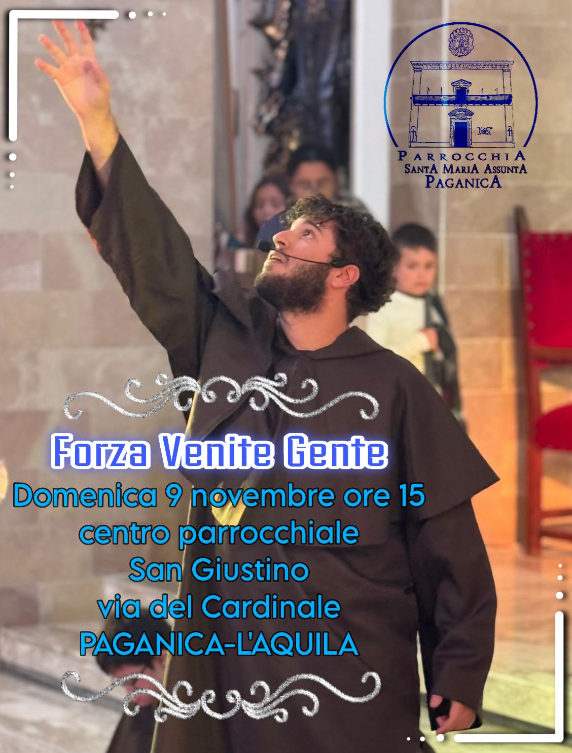 Continua il successo del recital “Forza Venite Gente AQ”, che domenica 9 novembre alle ore 15 approderà nella frazione aquilana di Paganica, presso il Centro parrocchiale San Giustino.