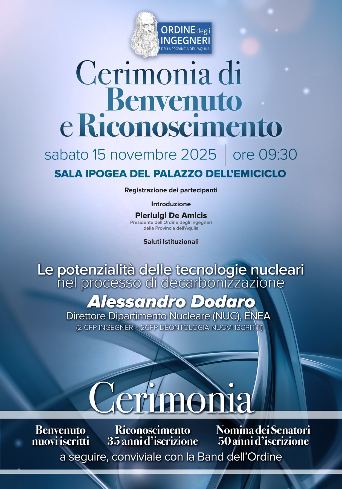 A ‘tenere a battesimo’ i nuovi iscritti e a salutare i decani dell’ordine provinciale del capoluogo abruzzese, che conta 2.921 aderenti, sarà Alessandro Dodaro, direttore del dipartimento nucleare dell’Enea, che terrà un intervento sulle potenzialità delle tecnologie nucleari nel processo di decarbonizzazione.