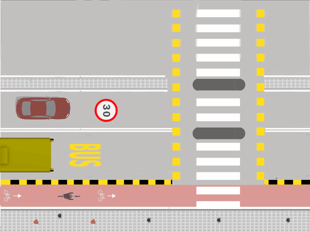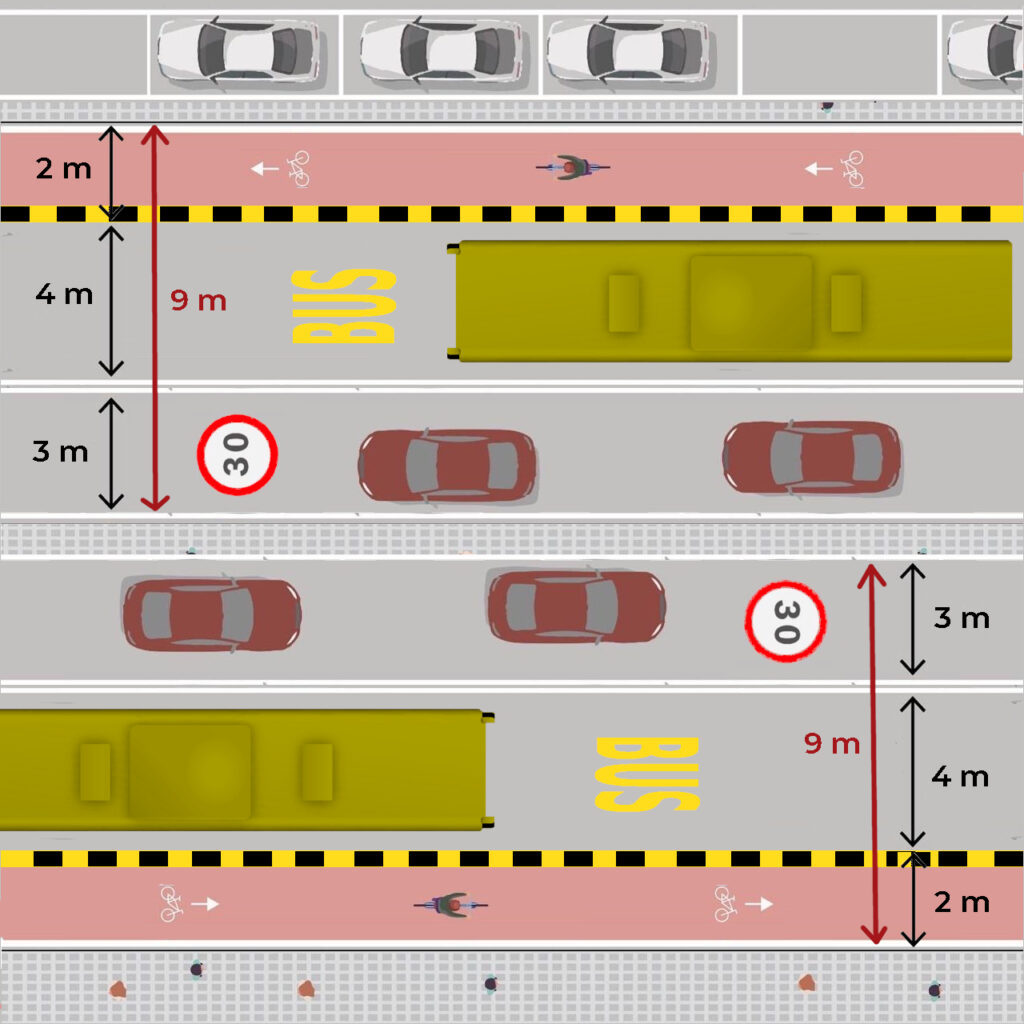 - Una pista ciclabile monodirezionale di 2 metri (compreso il cordolo di protezione di 50 cm)