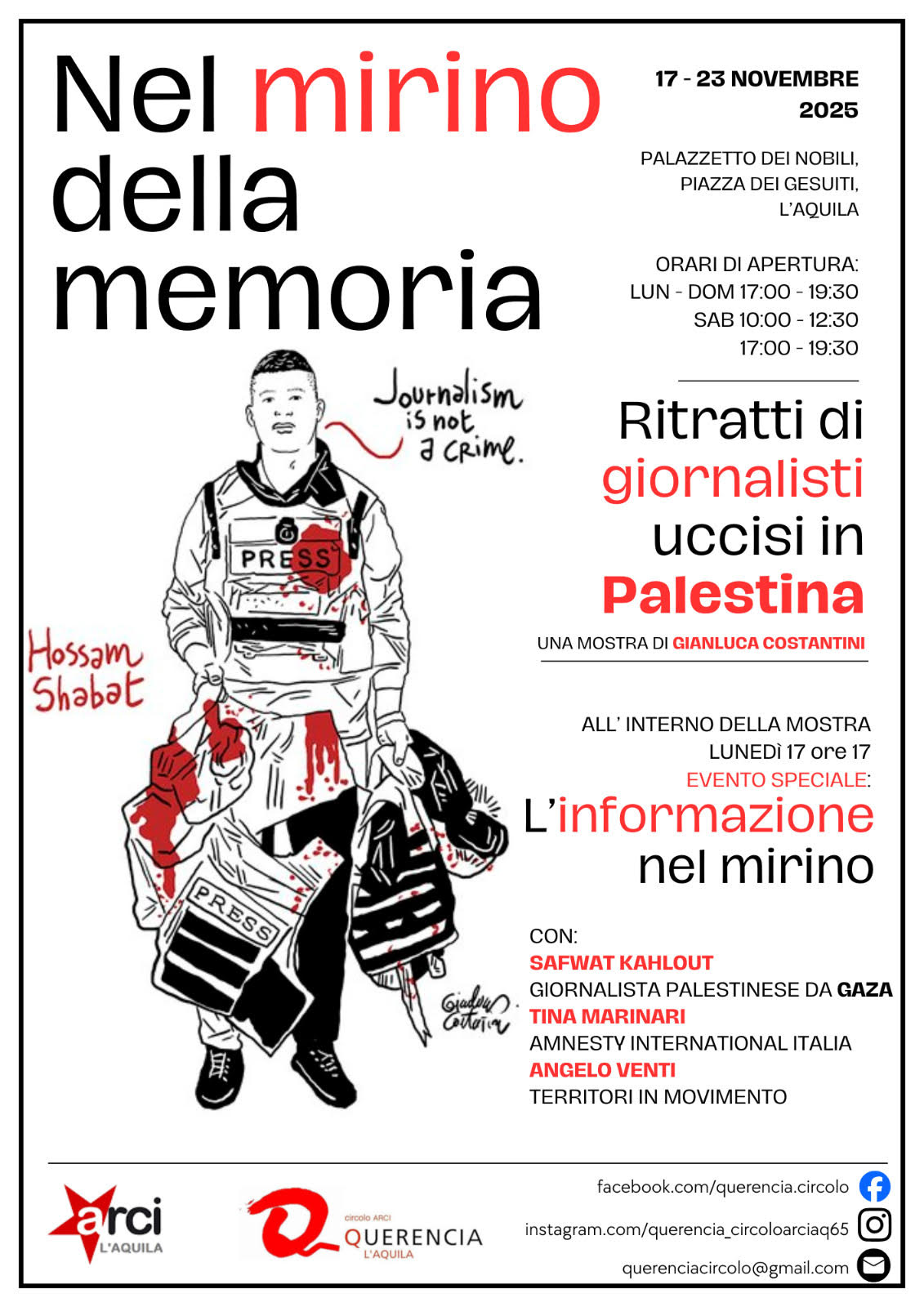 L’esposizione all’Aquila è promossa dal Circolo Arci Querencia e dal Comitato Territoriale Arci L’Aquila e sarà visitabile da oggi, lunedì 17 novembre, fino a domenica 23 novembre 2025 tutti i pomeriggi dalle 17.00 alle 19.30, con un’apertura straordinaria nella mattinata di sabato 22 novembre dalle 10.00 alle 12.30.