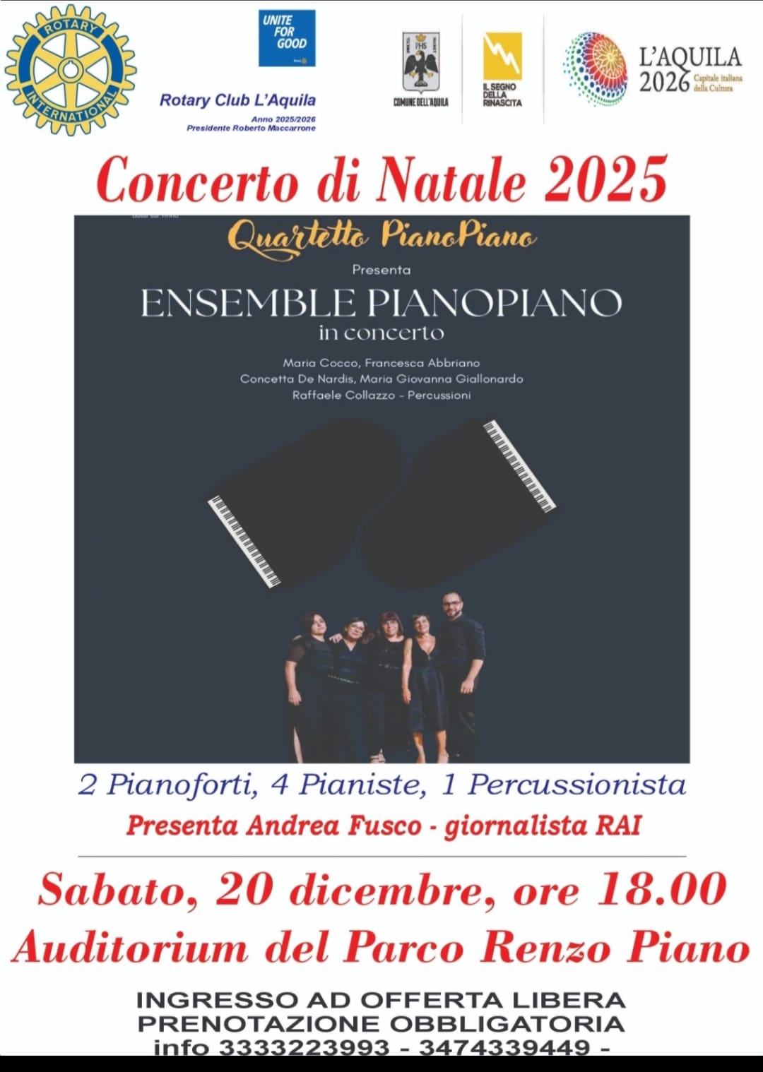 Sabato 20 dicembre alle ore 18 all’auditorium del parco, ci sarà il concerto di Natale del Rotary club L’Aquila.