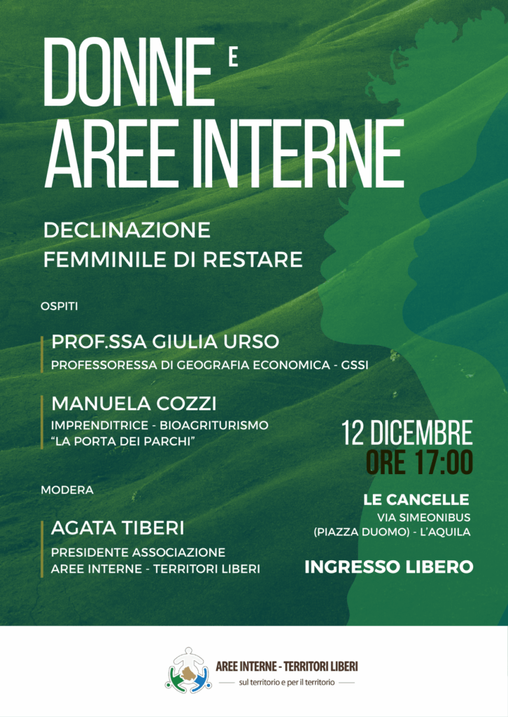 Un dibattito per riflettere sulle donne che abitano le aree interne. L’incontro pubblico “Donne e aree interne: declinazione femminile di restare”  che ci sarà il prossimo 12 dicembre alle 17,00 alle Cancelle (Piazza Duomo-L’Aquila), è promosso dall’associazione Aree interne-Territori Liberi che lavora per la valorizzazione, la tutela e lo sviluppo dei territori dell’entroterra abruzzese e per la connessione tra le persone che li abitano.