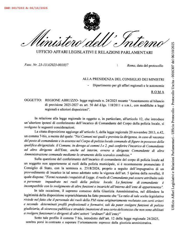 «In una nota indirizzata alla Presidenza del Consiglio, il Ministero dell’Interno presieduto dall’ex Prefetto Piantedosi, ribadisce che ‘il ruolo di Comandante può essere attribuito solo a personale appartenente ai ruoli della polizia locale, poiché tali figure sono reclutate con specifici requisiti professionali che le abilitano allo svolgimento di funzioni di polizia giudiziaria, sicurezza pubblica e polizia stradale’. Un sonoro schiaffo al sindaco dell’Aquila Pierluigi Biondi e a Marsilio i quali hanno imposto a Sospiri di modificare la norma».