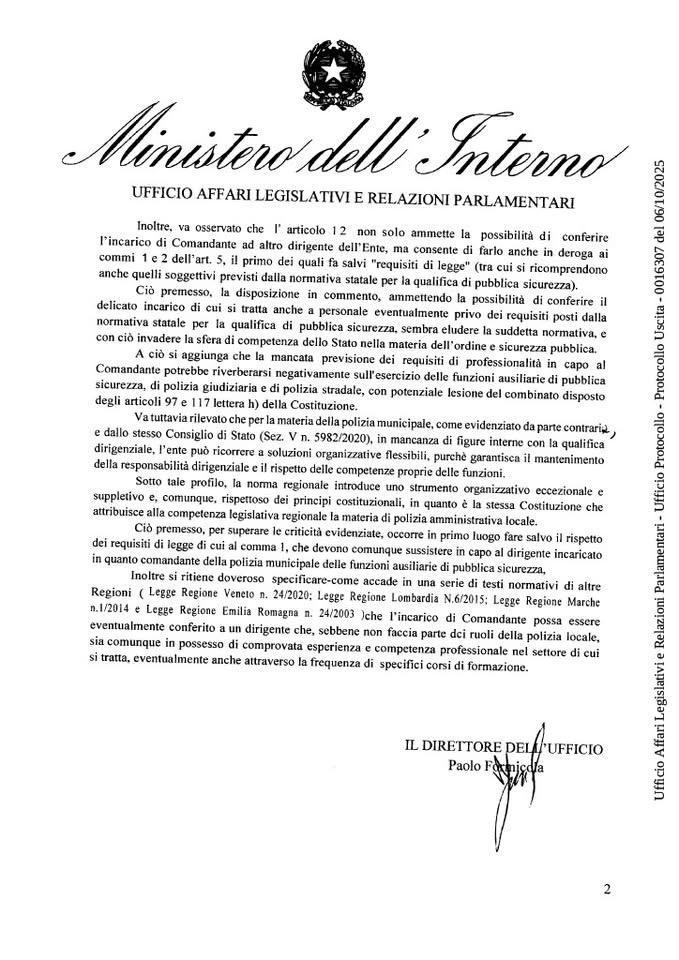 Secondo quanto evidenziato dal Viminale, la modifica alla legge regionale 42/2013 sulla polizia locale – introdotta “in extremis” nel corso dell’ultima sessione del Consiglio regionale – sarebbe illegittima e presenterebbe profili di incostituzionalità. La norma aveva riaperto la possibilità, contestata da anni, di affidare l’incarico di Comandante a un dirigente esterno al Corpo, scelta già ripetutamente censurata dal giudice amministrativo.