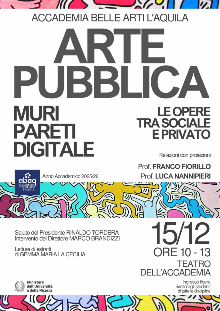 Lunedì 15 dicembre, a partire dalle ore 10, i professori dell’Accademia di Belle Arti de L’Aquila Franco Fiorillo e Luca Nannipieri terranno un incontro pubblico, aperto a tutti gli studenti, dal titolo: “Arte Pubblica. Pareti, muri, digitale. Le opere tra sociale e privato“.
