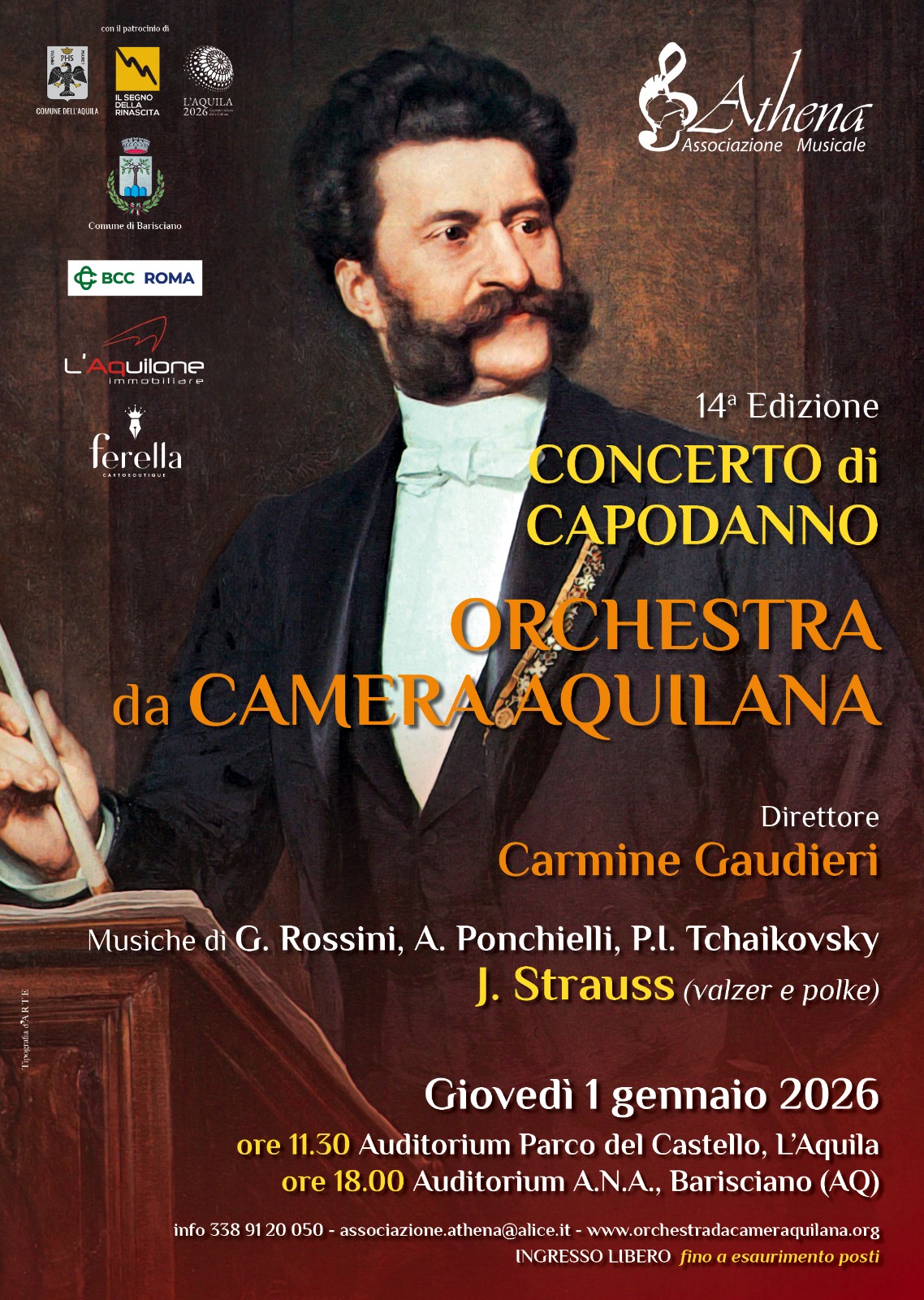 L’evento avrà luogo mercoledì 1 gennaio 2026 alle ore 11:30, presso l’Auditorium del Parco del Castello a L’Aquila. Organizzato dall’Associazione Musicale Athena nell’ambito del cartellone natalizio realizzato dal Comune dell’Aquila, il concerto è una consuetudine che si ripete ormai da 14 anni registrando un grande successo di pubblico. Sul palco salirà l’Orchestra da Camera Aquilana, diretta dal Maestro Carmine Gaudieri.