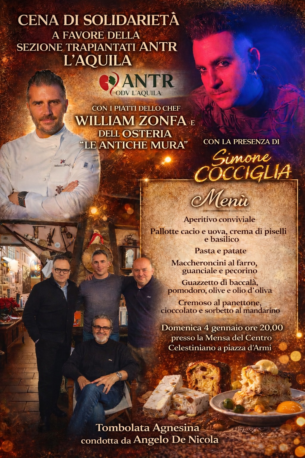 L’appuntamento è fissato per domenica 4 gennaio all’interno della Mensa, dove gli ospiti saranno accolti con un aperitivo in piedi con prosecco e prosciutto al coltello accompagnato da focaccia e zuppetta di ceci e castagne assieme ad altre prelibatezze; poi verranno serviti al tavolo, pasta e patate con crosta di reggiano pasta mista e scamorza per renderla più cremosa, spaghettoni di acqua e farina di farro con guanciale croccante e pecorino canestrato fatto dall’Osteria Antiche Mura. Chef Zonfa preparerà: pallotte cacio e uova con crema di piselli e basilico, baccalà e olive e olio evo e dolce.