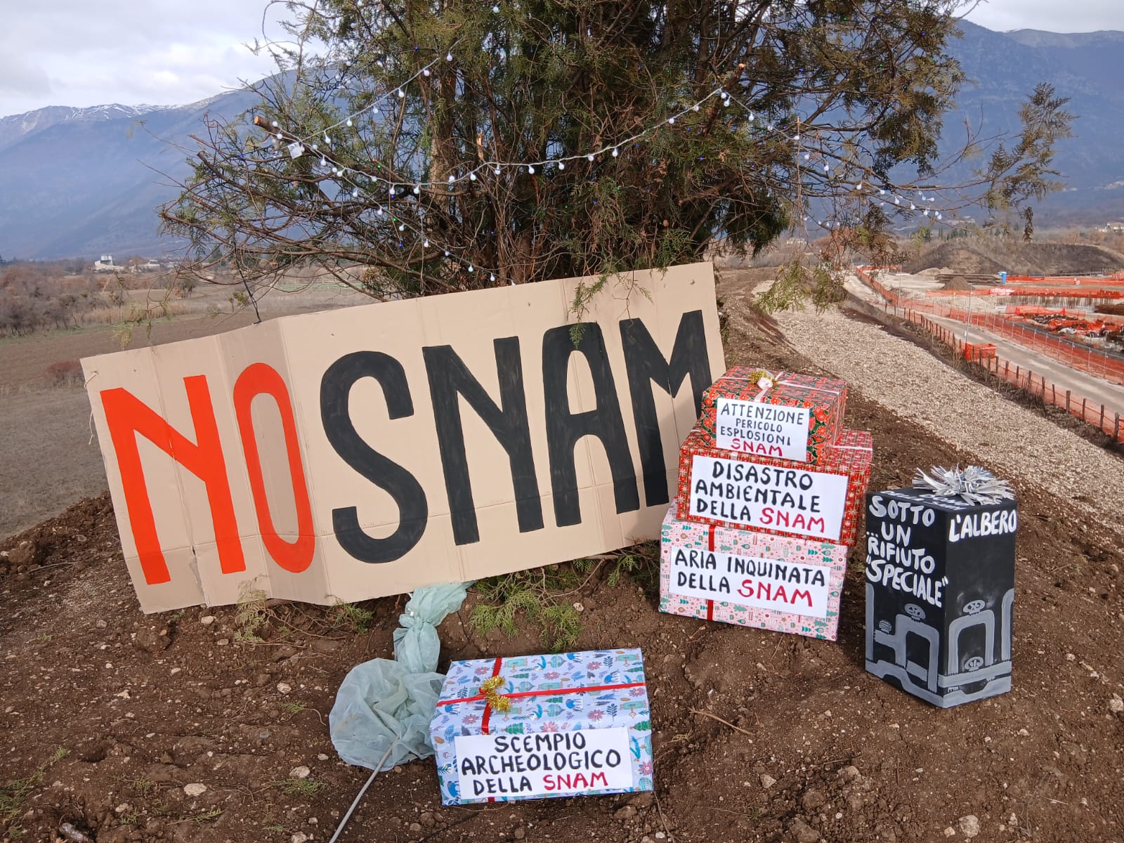 «La Snam ha avuto un bel pensiero per la città allestendo un albero di natale su una collina artificiale ben visibile anche da lontano – hanno dichiarato gli attivisti Mario Pizzola, Alba Silvani, Emilio Secchiatti e Daniela Colaberardino -, peccato però che la Snam si sia dimenticata di mettere sotto l’albero i doni per i cittadini. A questo abbiamo rimediato noi portando dei pacchi regalo con su scritto: “aria inquinata”, “distruzione ambientale”, “scempio archeologico”, “attenzione rischio esplosioni”. Questi sono i veri pacchi che la Snam sta rifilando al nostro territorio».