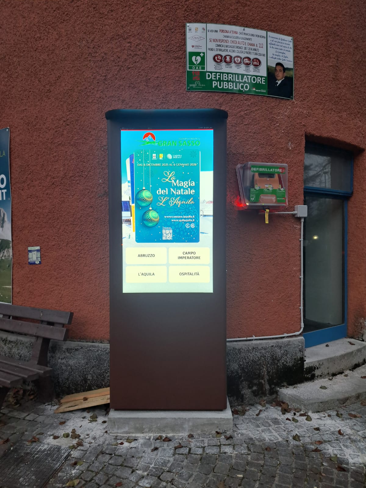 Il totem rappresenta un punto di riferimento strategico per i turisti che raggiungono Campo Imperatore, da cui il percorso esplorativo prosegue verso L’Aquila, città d’arte e di cultura, ricca di storia, monumenti ed eventi. Si tratta di un operatore multimediale touchscreen da esterno, progettato per garantire molteplici servizi informativi in modo semplice e intuitivo, consentendo ai visitatori di orientarsi facilmente e di scoprire opportunità legate alla natura, alla cultura, all’ospitalità e alle attività del Gran Sasso e del territorio circostante.