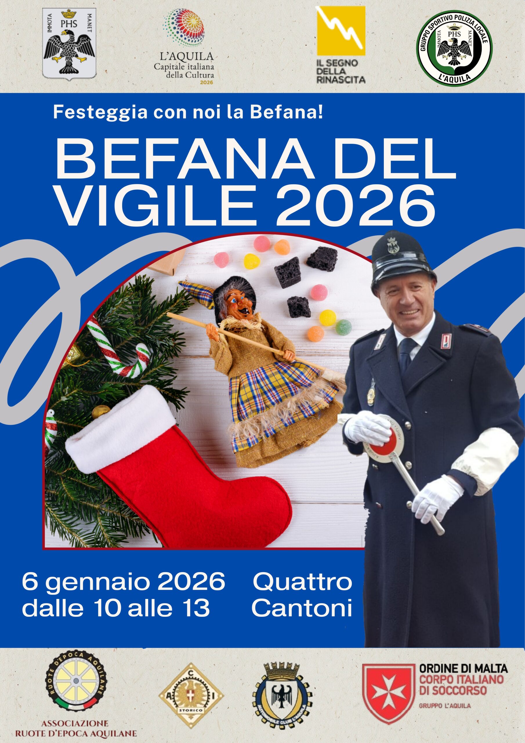 L’iniziativa, promossa dal Comando di Polizia Municipale in collaborazione con l’Associazione Ruote d’Epoca Aquilane, il Gruppo Sportivo della PM dell’Aquila, l’ACI ed il Corpo Italiano di Soccorso Ordine di Malta sezione dell’Aquila, si svolgerà il prossimo 6 gennaio nel consueto scenario dei Quattro Cantoni, dalle ore 10 alle ore 13.
