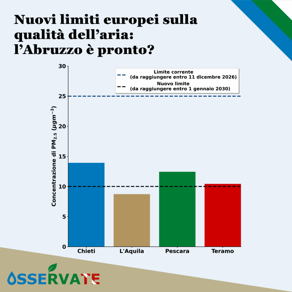 Il particolato atmosferico (PM 10 e PM 2.5 ), in base a un’analisi preliminare sui dati del 2025, pubblicata dalla rubrica OsservaTE e basata sulle rilevazioni ARPA Abruzzo, mostra infatti che le concentrazioni attuali sono generalmente al di sotto dei limiti da raggiungere entro l’11 dicembre 2026, termine fissato entro cui tutti i Paesi dell’Unione Europea dovranno adeguarsi a limiti più stringenti sulle concentrazioni di inquinanti, secondo la Direttiva europea per un’aria più pulita.