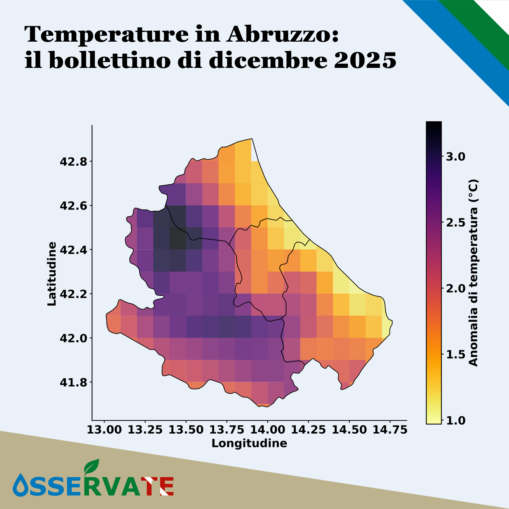 Dicembre 2025 si è concluso con temperature superiori alle medie storiche su tutto il territorio abruzzese. È quanto emerge dal bollettino climatologico mensile pubblicato dalla rubrica OsservaTE, il progetto dedicato all’analisi e alla divulgazione dei dati ambientali e climatici relativi alla regione Abruzzo.