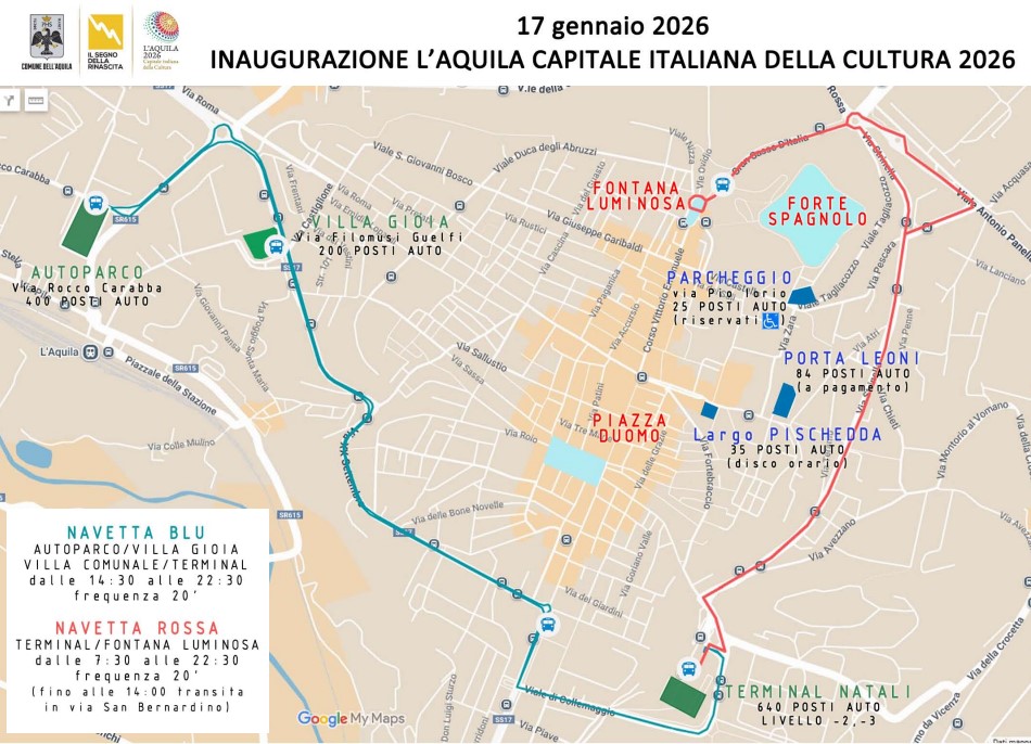 In occasione dell’apertura ufficiale dell’anno “L’Aquila Capitale italiana della Cultura 2026”, in programma sabato 17 gennaio, il Comune dell’Aquila informa la cittadinanza che saranno attuate importanti modifiche temporanee alla viabilità nelle zone interessate dagli eventi previsti nel pomeriggio, che interesseranno l’area del Parco del Castello e Piazza Battaglione Alpini (Fontana Luminosa), dove si svolgerà lo spettacolo di droni. Ulteriori iniziative sono previste in Piazza Duomo e, in serata, con performance di artisti di strada e musica itinerante.
