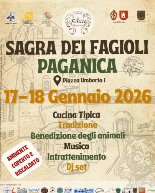 Sabato 17 e domenica 18 gennaio 2026, in piazza Umberto I a Paganica, torna la tradizionale sagra dei Fagioli con la benedizione degli animali, stand gastronomici e sfilata dei trattori e vespe d’epoca e musica.