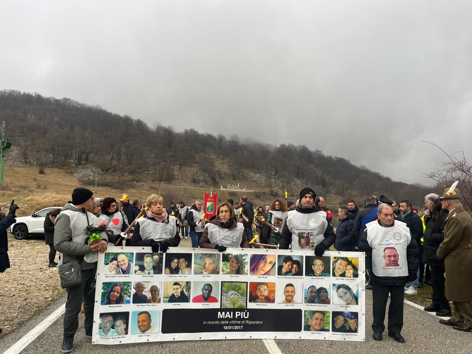 Alle 16:15 si è svolta la messa sul luogo della tragedia, con la lettura dei nomi delle 29 vittime e la deposizione di 29 rose bianche. Alle 16:49, orario in cui la valanga raggiunse l’hotel, il coro Pacini di Atri ha intonato il ‘Signore delle Cime’ e 29 palloncini bianchi sono stati liberati in cielo.