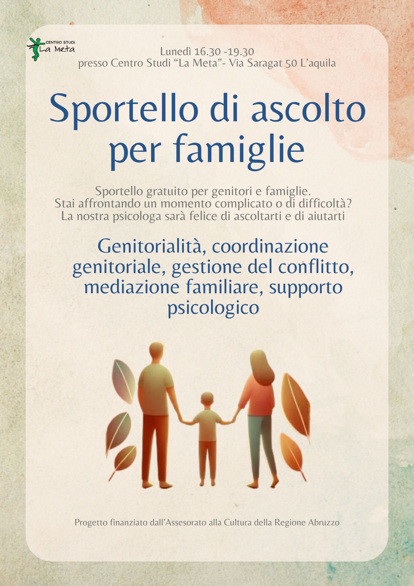 Uno sportello d’ascolto gratuito dedicato a ragazzi e famiglie sarà attivo da oggi, lunedì 2 febbraio e fino a giugno, nell’ambito del progetto “Radici e Ali”, finanziato dalla Regione Abruzzo.