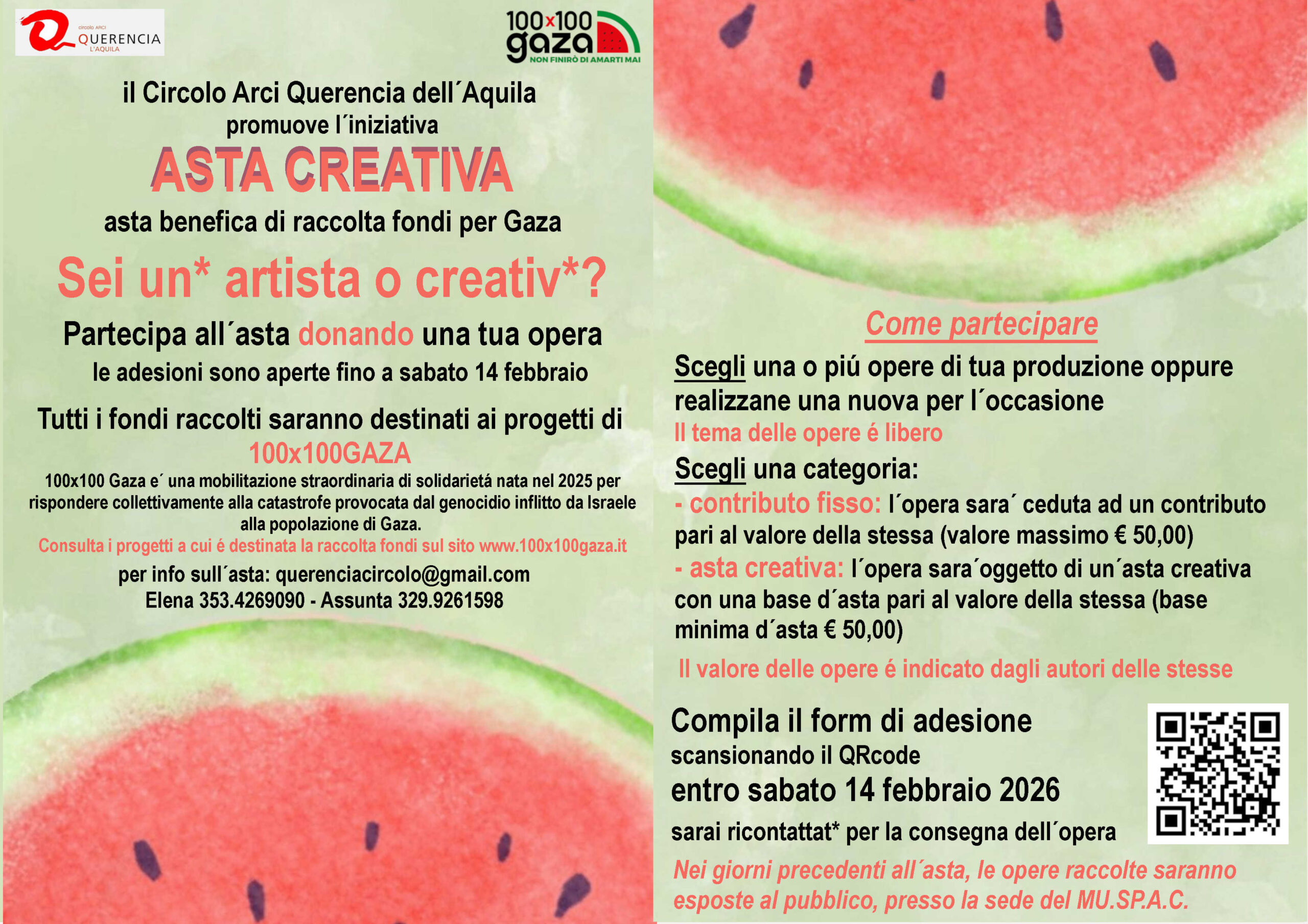 Sarà possibile aderire all’asta creativa fino a sabato 14 febbraio 2026 compilando il form di adesione al link https://forms.gle/yZRwZrn7t4gnA5Bj6 oppure scrivendo all’indirizzo email querenciacircolo@gmail.com o contattando i seguenti numeri telefonici Elena 3534269090 e Assunta 3299261598