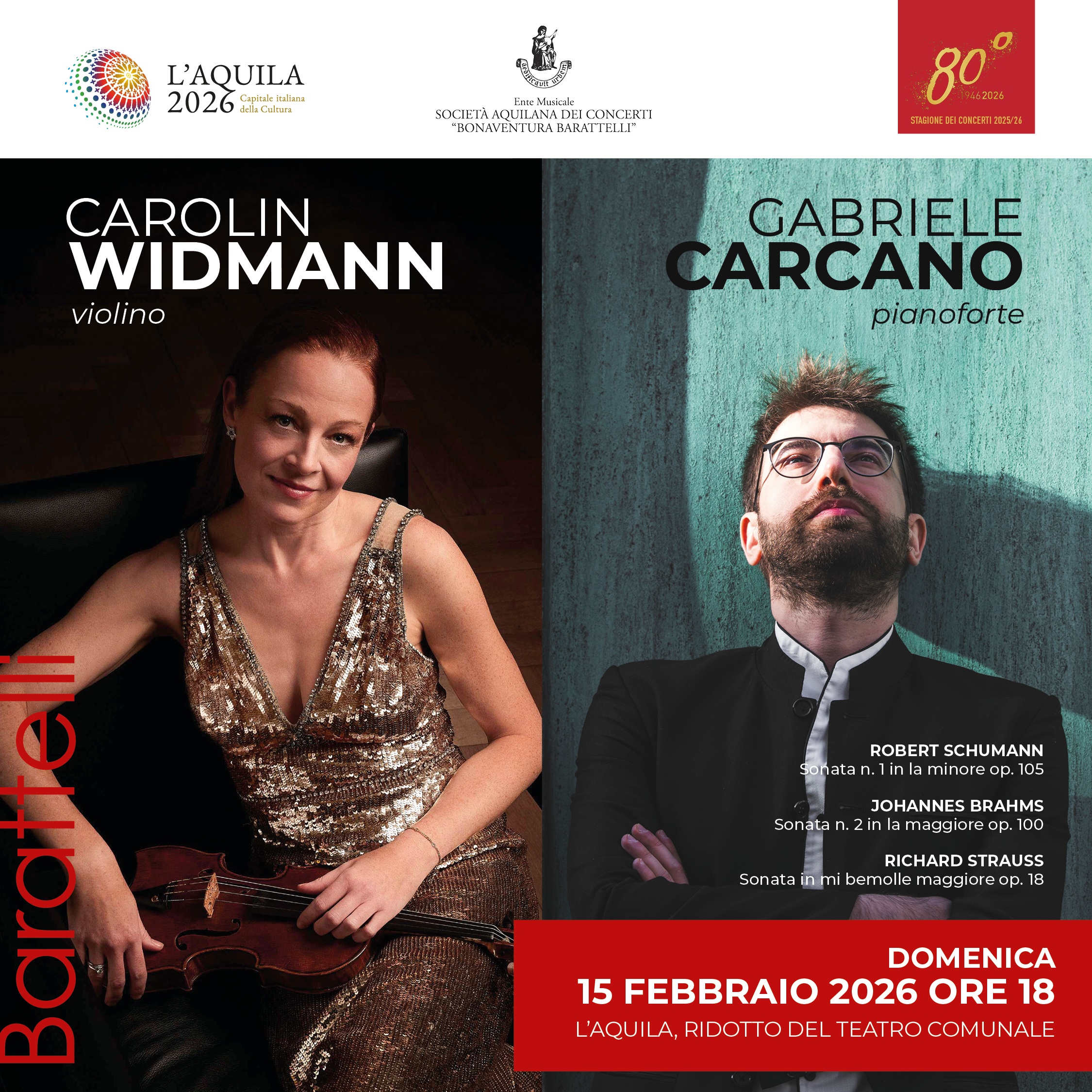 Prosegue la serie di concerti con grandi star del concertismo internazionale proposto dalla Società Aquilana dei Concerti “Bonaventura Barattelli” nell’ambito della ottantesima stagione. L’appuntamento in programma domenica 15 febbraio al Ridotto del Teatro Comunale con inizio alle ore 18 avrebbe visto la attesa esibizione dei fratelli Khachatryan, purtroppo impossibilitati per gravi motivi familiari. Per mantenere viva l’aspettativa di un concerto di alto livello, la Barattelli ha accolto con gratitudine la disponibilità a tornare ad esibirsi a L’Aquila della straordinaria violinista Carolin Widmann, questa volta insieme al pianista Gabriele Carcano. Entrambi, infatti, sono stati già protagonisti di memorabili concerti, sempre nei cartelloni della Barattelli, rispettivamente nel 2022 Carolin Widman e in recital nel 2017 Gabriele Carcano.