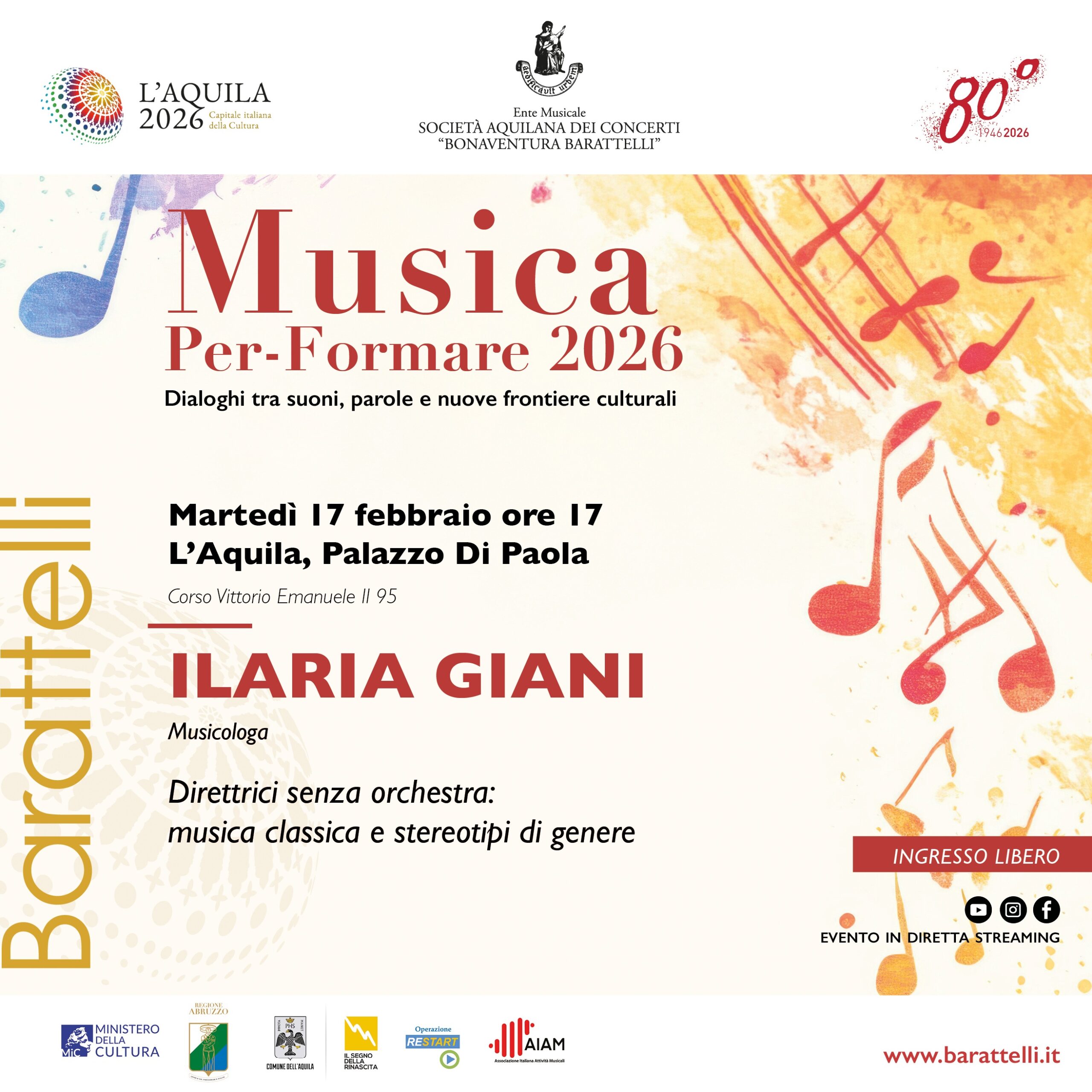 Il secondo appuntamento del progetto “Musica Per-Formare – Dialoghi tra suoni, parole e nuove frontiere culturali” ideato dalla Società Aquilana dei Concerti “Bonaventura Barattelli” per L’Aquila Capitale della Cultura 2026 tratta un tema di grande attualità ed interesse, quello della parità di genere nel settore professionale della musica, in particolare del riconoscimento del ruolo di direttrice d’orchestra.