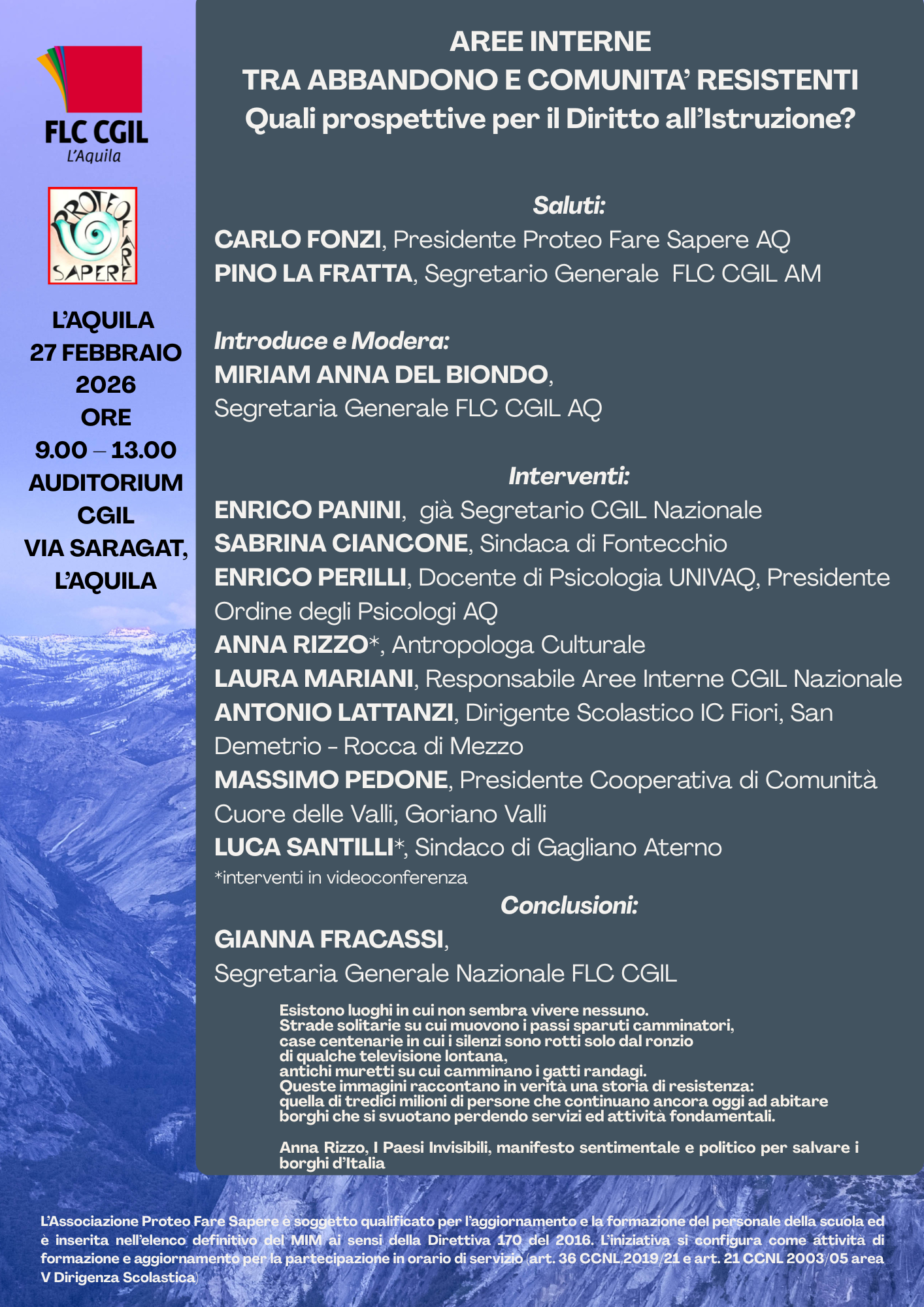 L’iniziativa, dal titolo “Aree Interne. Tra Abbandono e Comunità Resistenti. Quali prospettive per il diritto all’istruzione?”, è promossa dalla FLC CGIL insieme a Proteo Fare Sapere ed è aperta a tutta la cittadinanza.