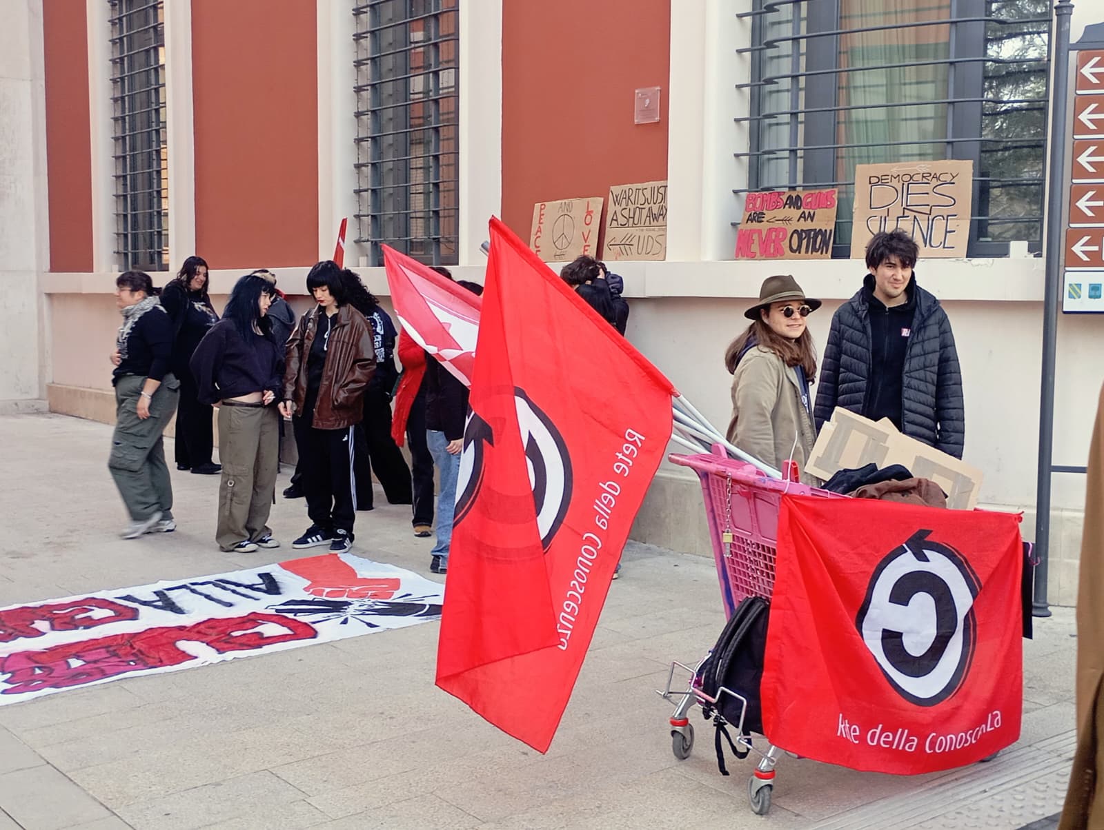 «Siamo in piazza contro uno stato che ci vuole usare come carne da macello per le sue guerre» afferma Francesco Filippone, responsabile organizzazione dell’UdS Abruzzo, spiegando le motivazioni della protesta. L’indignazione delle studentesse e degli studenti si riferisce in particolare alle esternazioni del Ministro della Difesa Guido Crosetto riguardo la possibile introduzione della leva militare volontaria sull’esempio della Germania, una proposta che prevedrebbe la proscrizione obbligatoria in caso di mancato raggiungimento della soglia prevista. «Questo non ci sta bene – prosegue Francesco – così come non ci sta bene questa retorica della guerra che è sempre più presente nei luoghi di lavoro e nelle scuole. Perché è proprio a partire dalla scuola che si può costruire la pace, perché è lì che si forma un pensiero critico Nei posti di lavoro così come nelle scuole è sempre più presente una narrazione che addolcisce il mondo della guerra, mentre i luoghi del sapere dovrebbero promuovere pensiero critico. La pace si costruisce a partire dalla scuola, dove si costruisce pensiero critico».