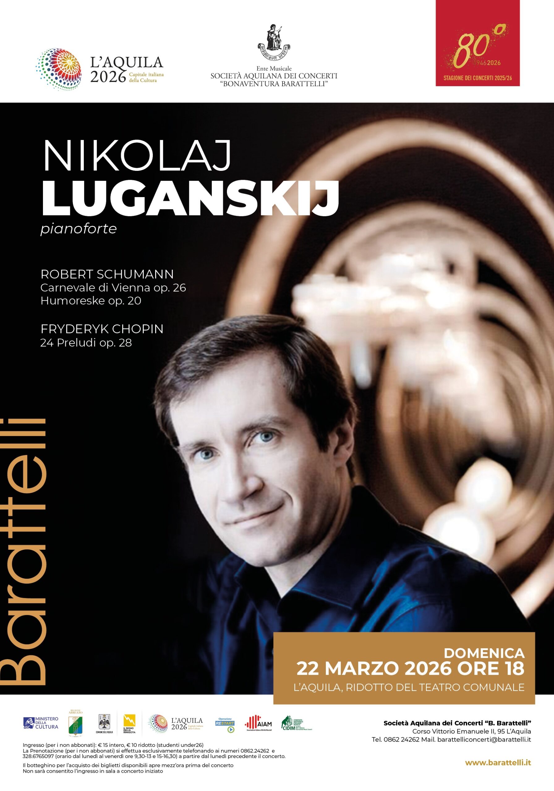 L’ottantesima stagione della Società Aquilana dei Concerti “B. Barattelli” accoglie uno dei più grandi pianisti della scena internazionale: Nikolaj Luganskij, protagonista di un recital di straordinaria intensità musicale in programma domenica 22 marzo 2026 alle ore 18 presso il Ridotto del Teatro Comunale.