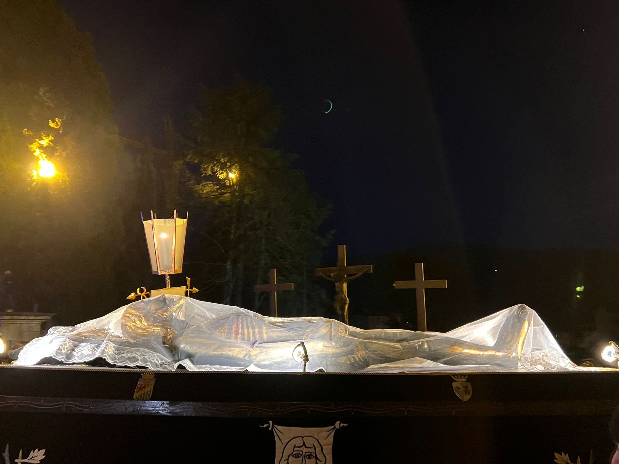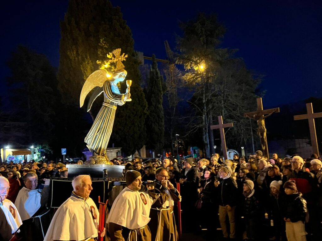 L’opera, realizzata dall’artista Remo Brindisi, è tornata a sfilare ieri mostrandosi in tutta la sua forza espressiva, accompagnata dalle altre figure iconiche del corteo: la Vergine Addolorata e l’Angelo con il calice.