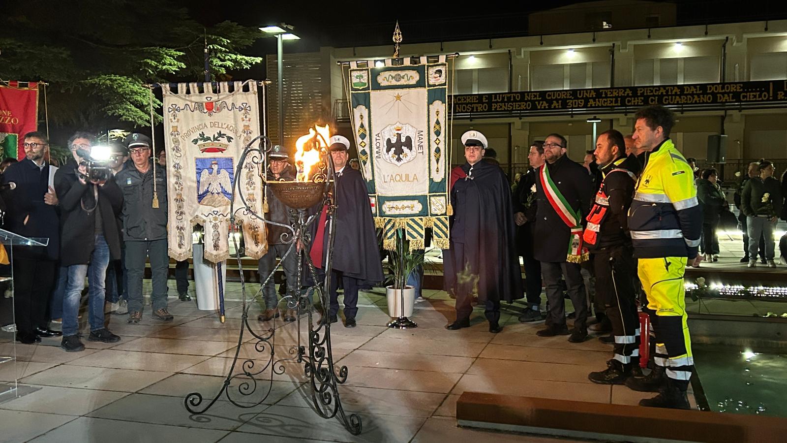 Nel Parco della Memoria è stato celebrato il gesto simbolico dell’accensione del braciere, affidata a Daniele Ciuffetelli, in rappresentanza del Comune dell’Aquila, seguita dalla lettura dei nomi dei 309 angeli dell’Aquila e da riflessioni condivise. Poco dopo la mezzanotte, i fiori distribuiti sono stati deposti in corrispondenza dei nomi incisi sulla fontana del Parco, in un gesto collettivo di memoria.