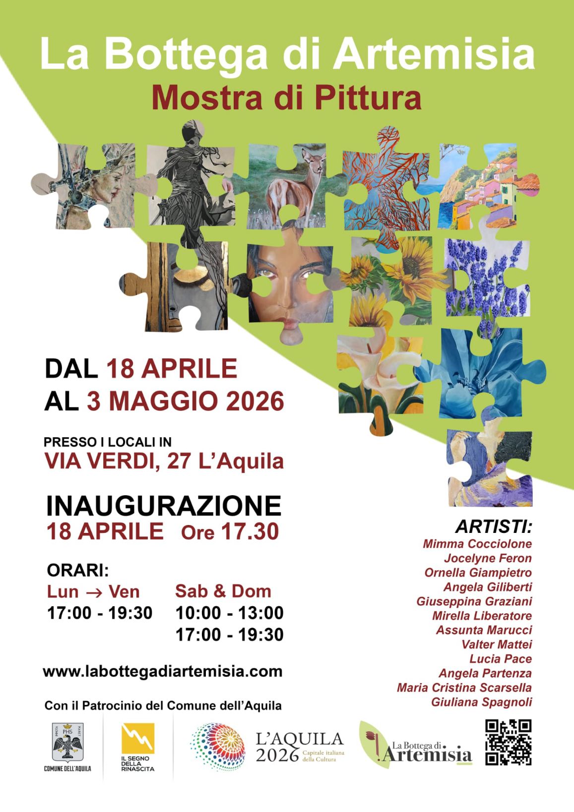 Spirito di gruppo, scambio di idee e fertile collaborazione. Tutto questo si nasconde dietro la V mostra Collettiva di Pittura promossa dalla Bottega di Artemisia che sarà inaugurata sabato prossimo,18 aprile, alle 17:30 all’interno dei locali del”Teatro Rinasce AQ” in via Verdi 27, messi gentilmente a disposizione dalla ditta Rosa Edilizia s.r.l.
