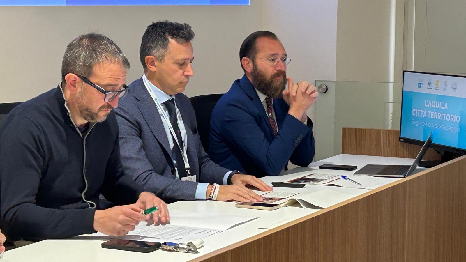 Alla presentazione del progetto, il sindaco dell’Aquila, Pierluigi Biondi, il titolare dell’Usrc, Raffaello Fico, e il manager culturale Agostino Riitano.