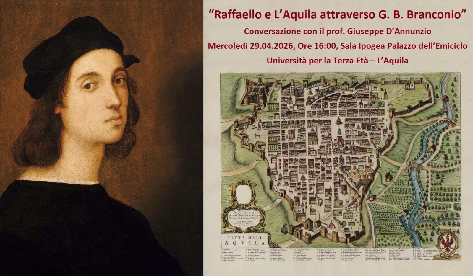 Prosegue l’attività dell’Università per la Terza Età dell’Aquila con l’incontro dal titolo “Raffaello e L’Aquila attraverso G. B. Branconio“, in programma mercoledì 29 aprile alle ore 16.00 nella sala ipogea di Palazzo dell’Emiciclo. Ospite della conversazione sarà il professor Giuseppe D’Annunzio, che approfondirà il rapporto tra il grande maestro del Rinascimento e il contesto aquilano.