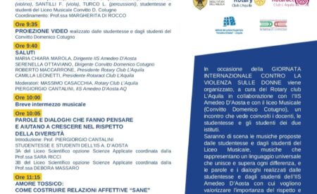 In occasione del 25 novembre, Giornata internazionale per l'eliminazione della violenza contro le donne, nelll'aula magna dell'Istituto Amedeo d'Aosta, a partire dalle ore 9:30, è stato organizzato, a cura del Rotary club L’Aquila in...